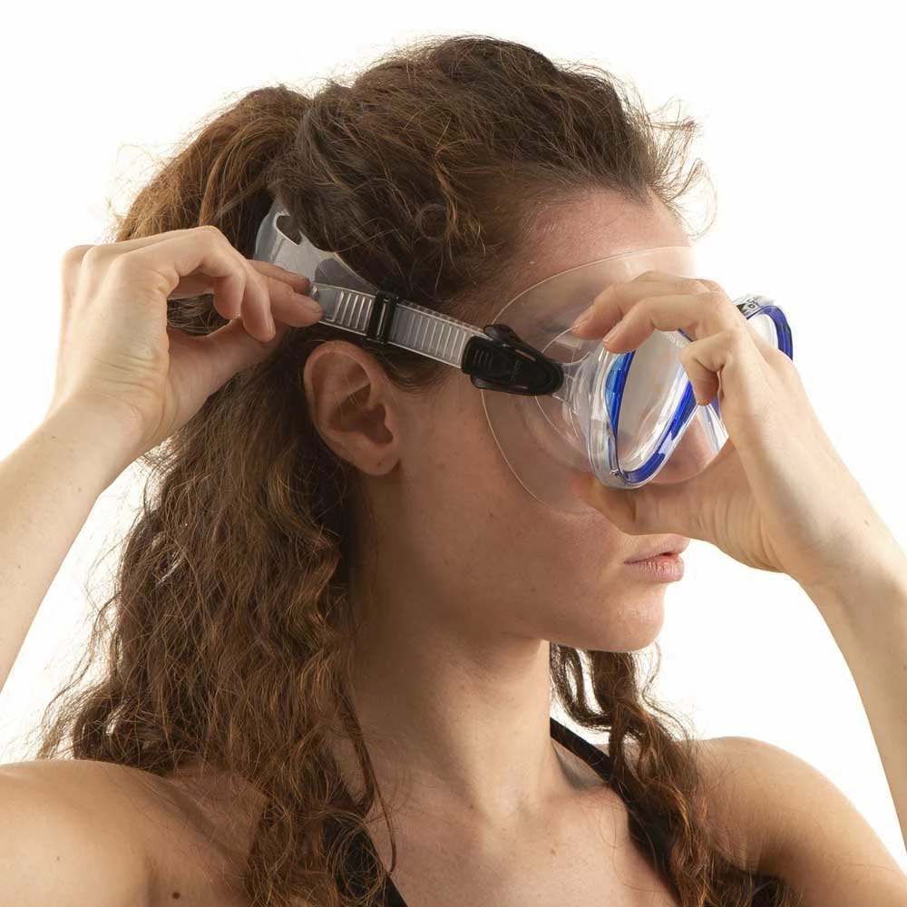 Twin lens mask in tempered glass available with skirt in hypoallergenic silicon or in phthalate-free Siltra.