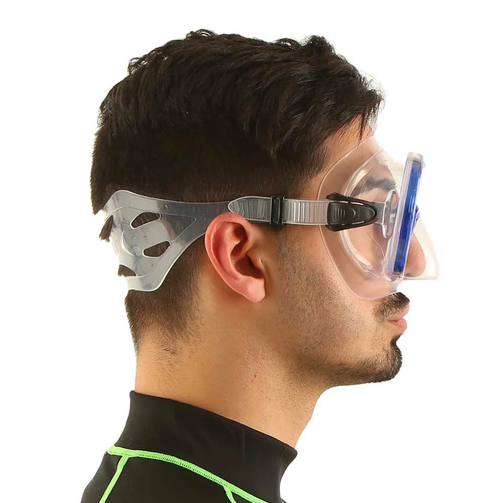 Single-lens mask in tempered glass available with skirt in hypoallergenic silicon or in phthalate-free Siltra.